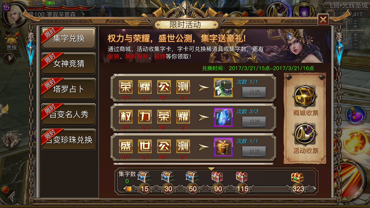 3月23日0:00-28日23:59,荣耀公测,集字赢好礼。活动期间,游戏内开放集字兑换活动,玩家可完成每日专属任务获得字卡、也可通过商城开启魔龙礼包获得字卡。上交不同的字卡组合,集齐“荣耀公测”四字后,可于兑换界面中换取坐骑:魔法战羊。