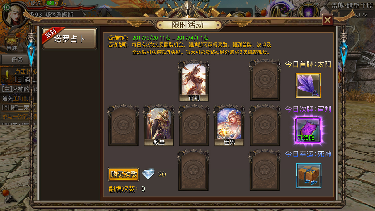 3月23日0:00-28日23:59,活动期间将开放全新活动塔罗占卜。在活动开放期间,玩家每日可获得3次免费翻牌机会,还可额外花费绑钻购买3次翻牌机会;每次翻牌均可获得翻牌奖励(含神翼之羽、坐骑珍脯、3级宝石等),除此之外,翻到今日首牌、次牌、幸运牌还可获得额外奖励。