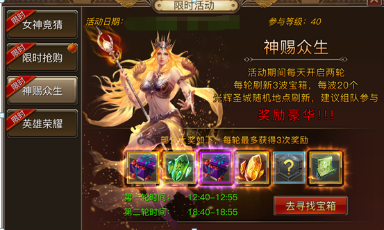 活动开放期间,众神将在光辉圣城散布神之恩赐,40级以上玩家可在光辉圣城内寻找宝箱,开启后有几率获得诸如6级宝石礼包、4级幸运石、3级随机铭文、高级锁定符在内的给力奖励。