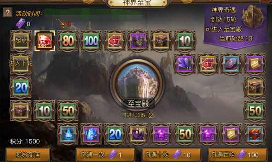 玩家每走一圈视为完成一轮,完成一定轮数可获得进入至宝殿抽奖机会,至宝殿内奖品不会重复获得,最高会有坐骑:炽焰飞龙等着您!
