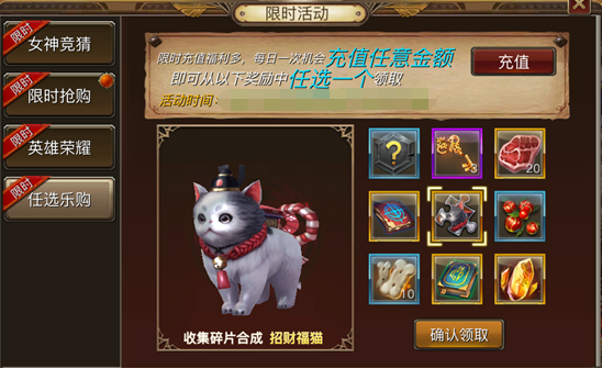 活动开启时,玩家只需每天充值任意金额,就可以在【任选乐购】活动界面中的多个奖励中选择一个领取;奖励包含了坐骑:招财福猫碎片,玩家集齐20个即可兑换完整坐骑,快来参与吧!