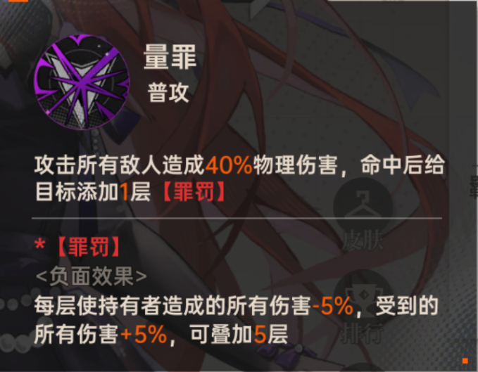 - 效果:攻击所有敌人造成物理伤害,命中后给目标添加【罪罚】。