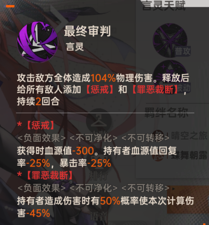 - 效果:攻击敌方全体造成物理伤害,释放后给所有敌人添加【惩戒】和【罪恶裁断】。
