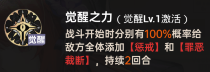 觉醒1星:战斗开始时给敌方全体添加【惩戒】和【罪恶裁断】(提前施加debuff,压制敌方开局节奏 )。