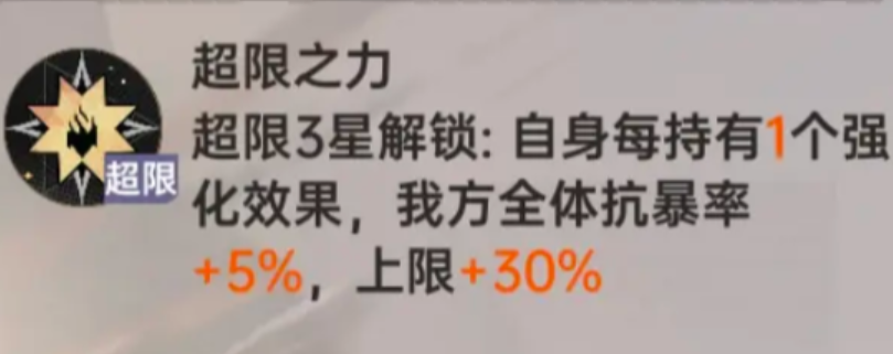 超限3星:自身每持有1个强化效果,我方全体抗暴率提升(绘梨衣自身强大了,也不会忘记团队生存保障哦,专员勇敢往前冲,绘梨衣会一直在专员身后守望)