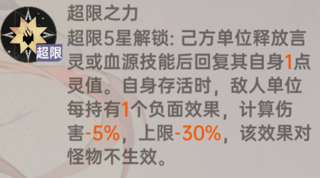 超限5星:己方单位释放言灵或血源技能后回复其自身灵值;自身存活时,敌人单位每持有1个负面效果,计算伤害降低(对怪物不生效,强化团队技能循环+根据敌方负面层数减伤,越打越肉 )。