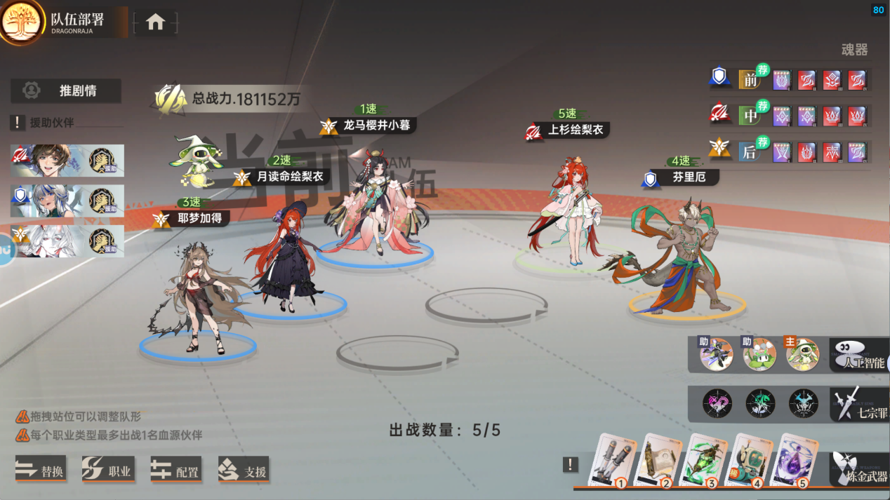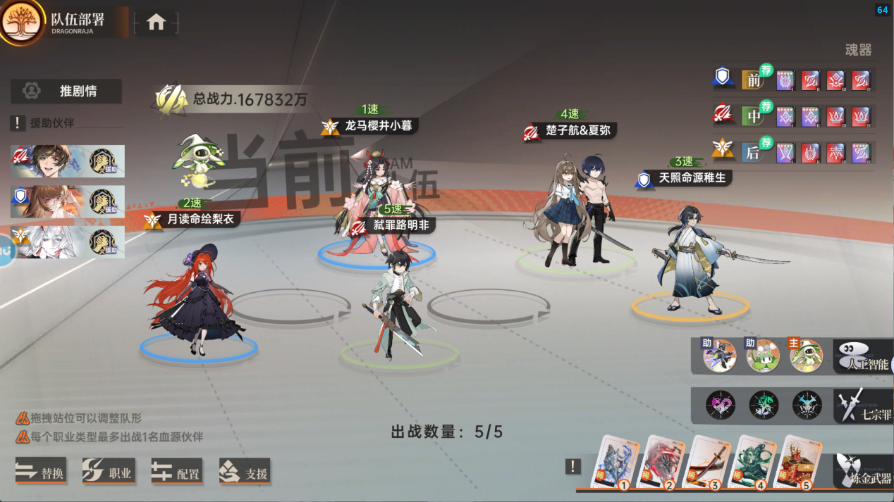 支援 主角(攻击-破军)+源稚女+傲慢剑灵(社团周三,周六剑域试炼获取;一周年庆期间签到获得)