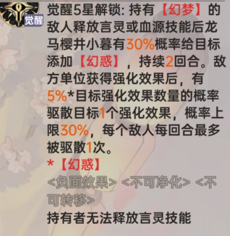 觉醒一开局就给敌方挂上负面,且普攻,言灵,都有概率给敌方施加负面效果触发天照命龙文套装效果,并且有概率驱散敌方所有单位一个强化效果,配合普攻添加的罪罚,言灵添加的惩戒,罪恶裁断,以及觉醒三的减灵效果直接将敌方压制拉满