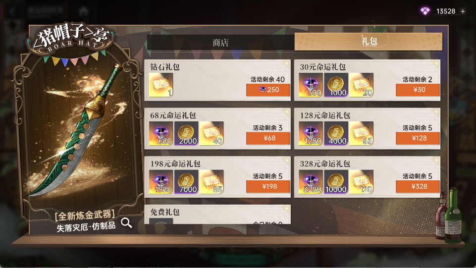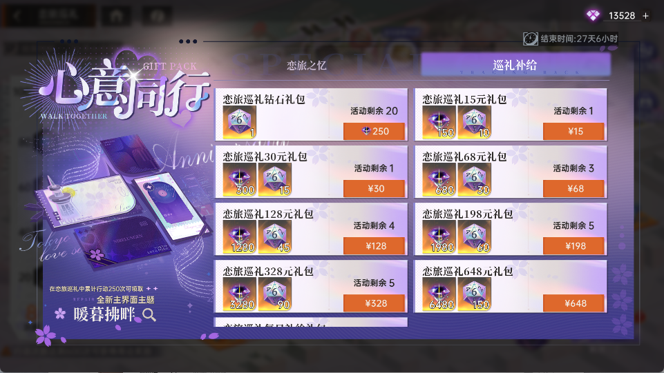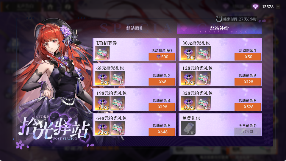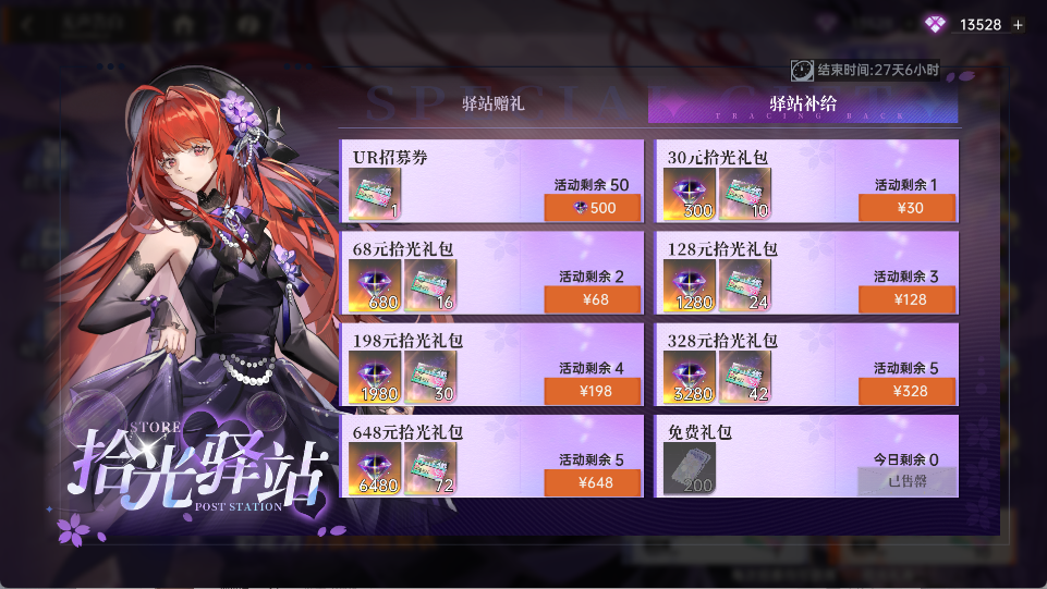 清空:【拾光手记】、【拾光驿站】、【高天原酬宾】【<猪帽子>亭-礼包】【里昂妮丝巡礼】【恋旅巡礼-心意同行】所有档位礼包。