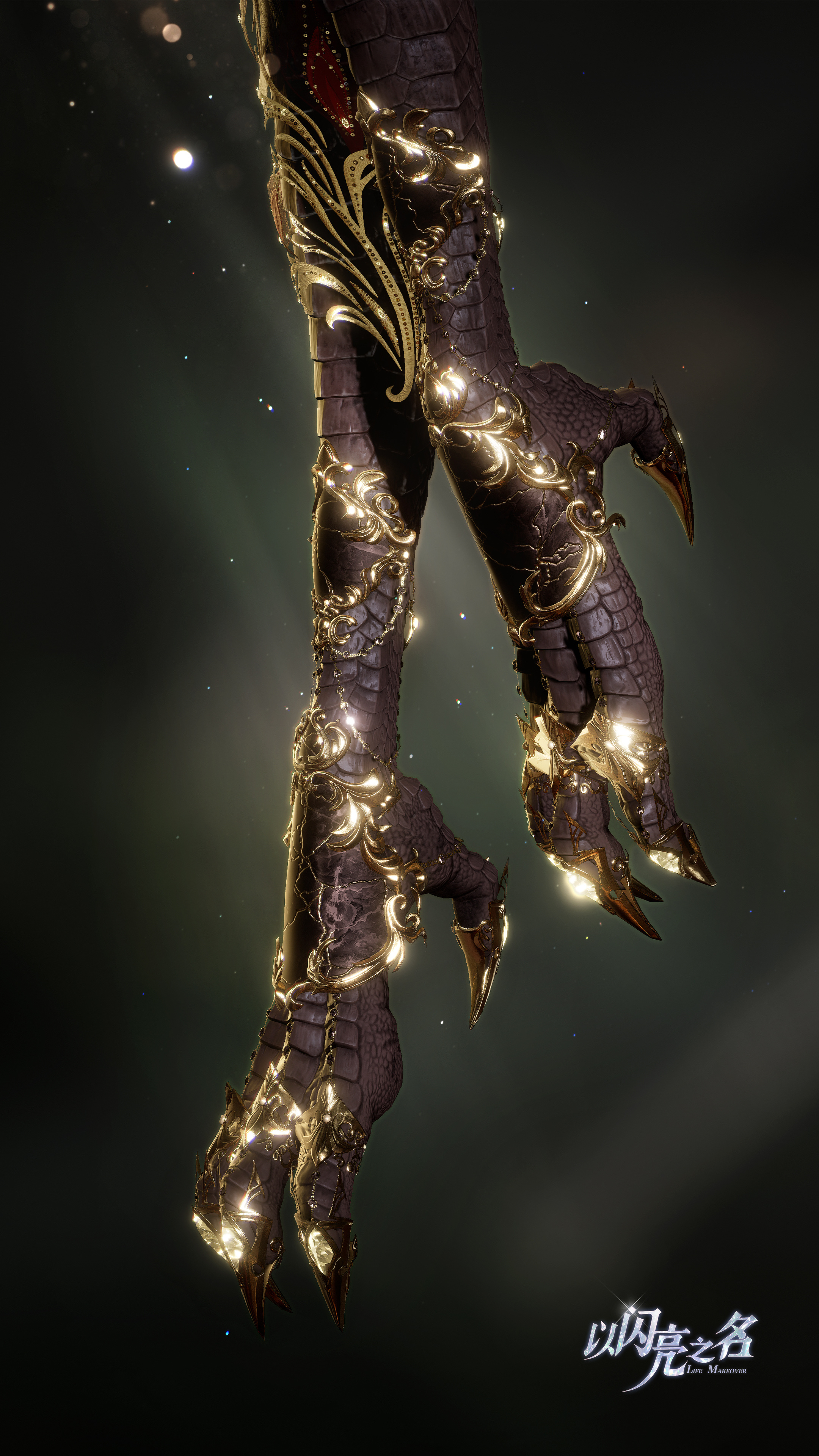 但挑战也随之而来。在制作中,最大的难题是如何在繁复的羽毛堆叠中保持清晰的层次感。如果所有羽毛质感相近,动态与光影不加区分,最终效果只会“糊成一团”,彻底失去神鸟应有的灵气与精致。为了让每一根羽毛都能如“自然律动般呼吸”,我们研发团队明确区分了各层羽毛的材质与形态。可以看到在纱制的羽毛这里,我们为其做了半透渐变与边缘提亮,并在尖部点缀了闪点,让它轻盈而独特;而腰部的羽毛,我们则在边缘区域增加了类似鎏金的质感,使其在厚重与华丽间取得平衡。