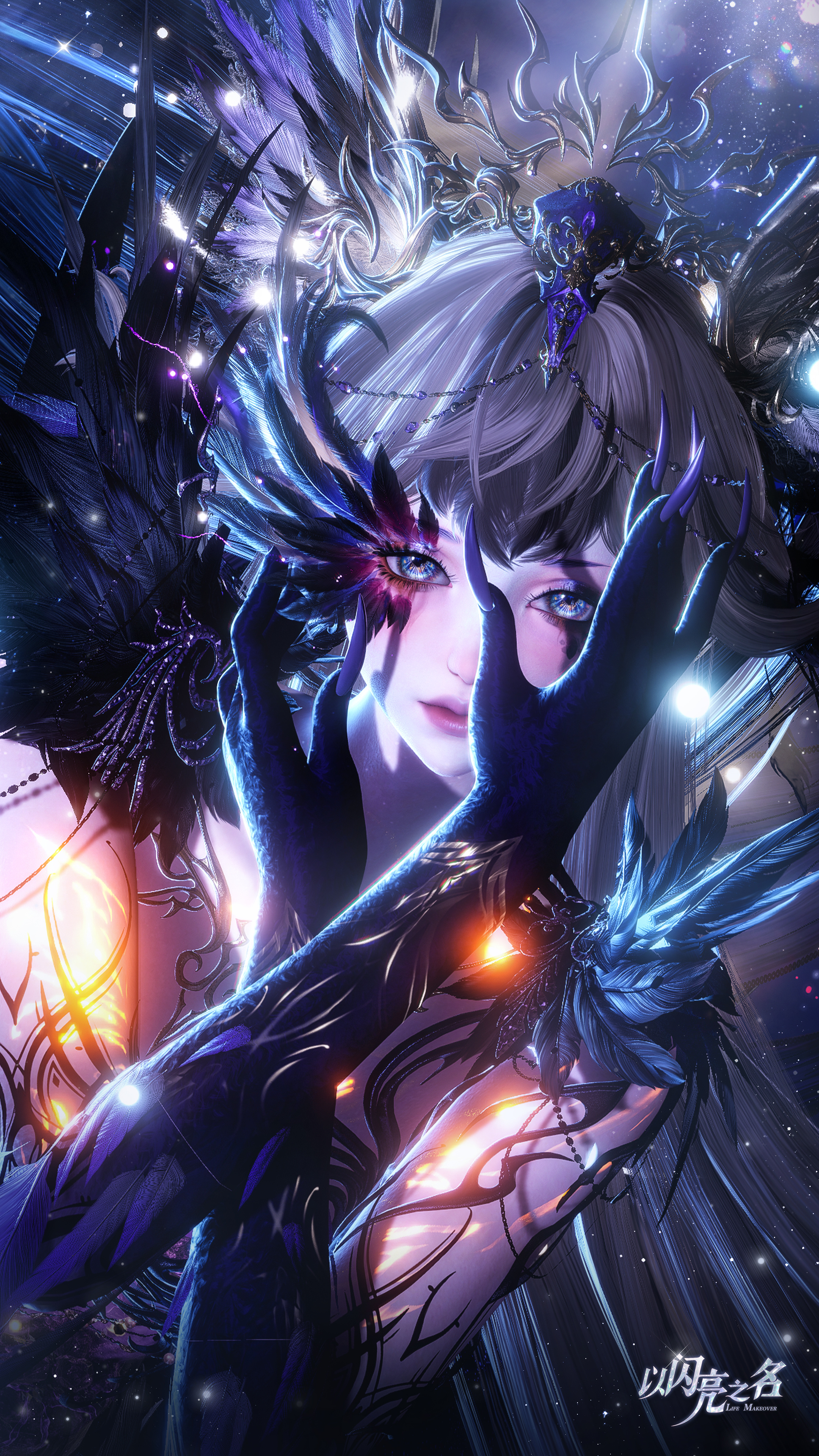 【发丝双材质创新】发型采用羽毛与发丝双材质结合,模仿鸟类羽毛的层叠结构,发尾流光涌动。