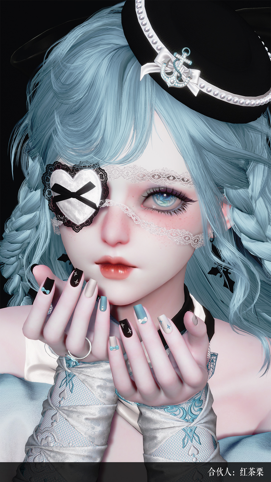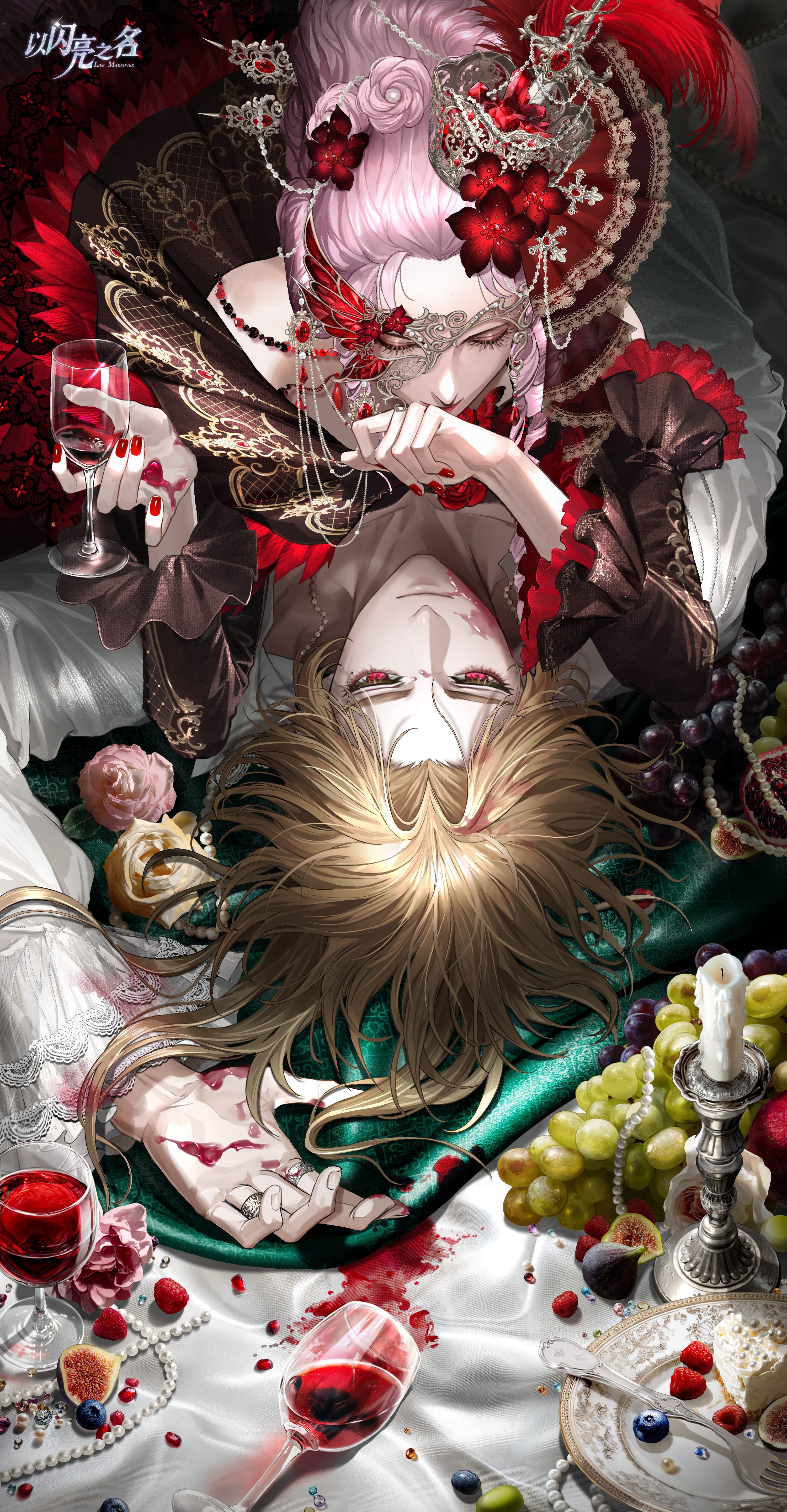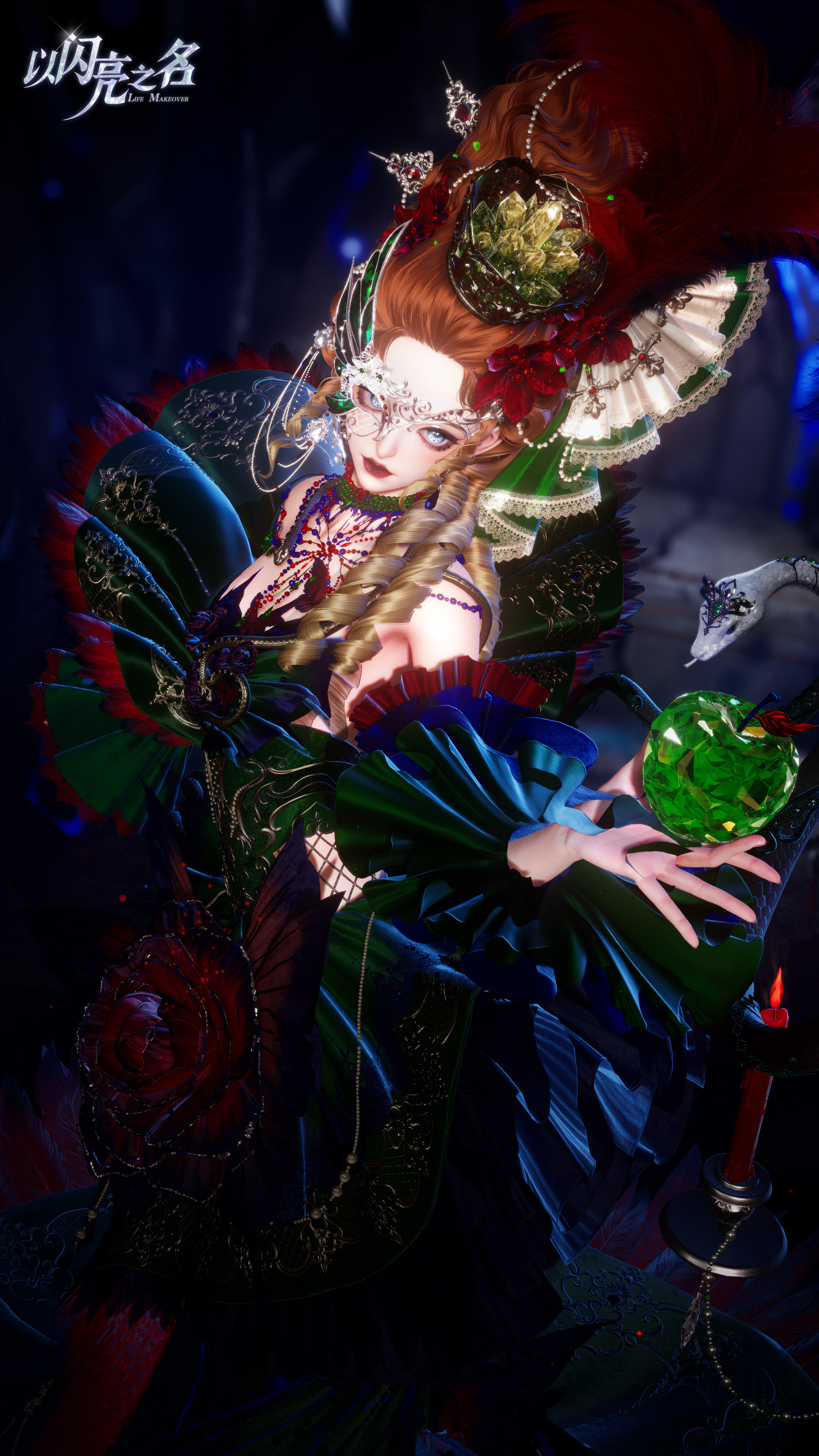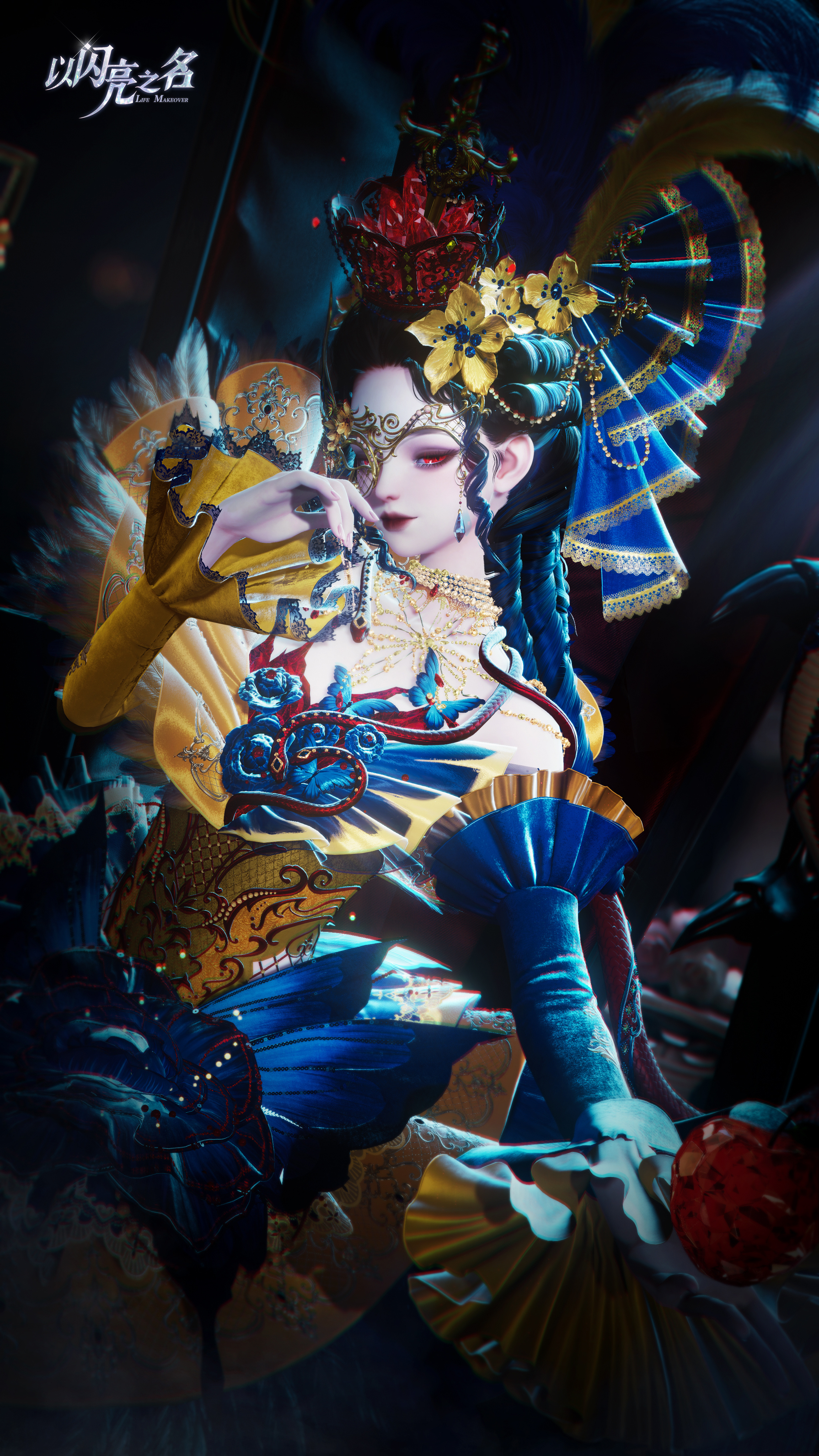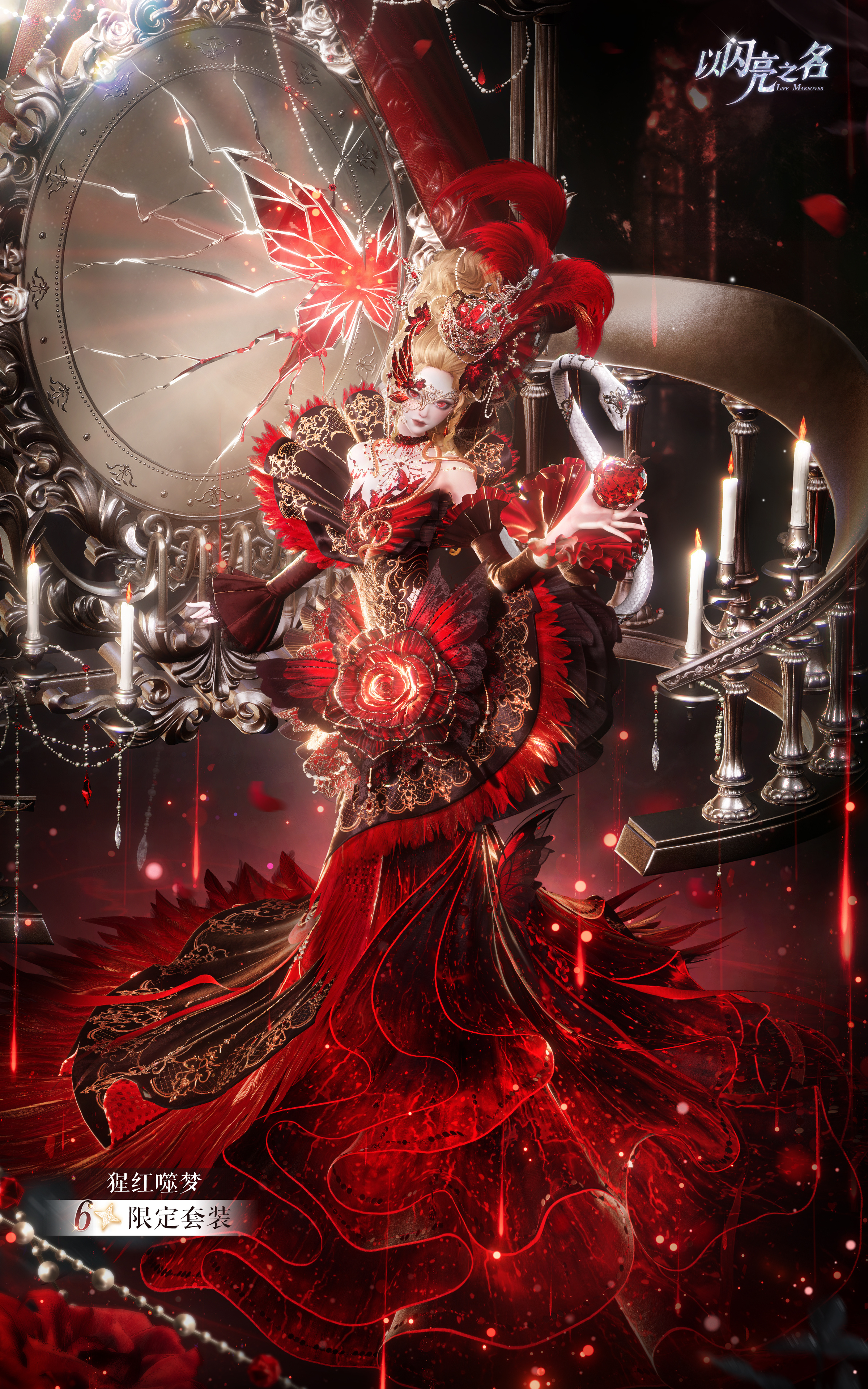 下裙的上半部分以结构化裙片为核心,叠加抽褶半透视纱,层层展开,形成外扩而复杂的裙摆轮廓。它并不追求绝对的对称,而是刻意制造张力,让布料在行走与旋转中呈现出被牵引、被拉扯的动态感。红色布条自裙身垂落,与脚下那一滩始终荡漾的绯色汁液相连,营造出绯色汁液向上蔓延、被角色吸收的视觉错觉,使人物仿佛正站在一场尚未结束的仪式中心。头部造型则进一步强化这种“不安定的华丽”。夸张的欧式大发冠向上延伸,洛可可高发被复杂头饰与高耸羽毛包裹。头饰主体是一只类皇冠的“食盆”,其中堆叠着红宝石,如同被端上的盛宴,而插入其中的餐刀,让欲望与暴力在同一瞬间被凝固。白蛇缠绕身体,蛇身垂挂着苹果,伊甸园的隐喻被直接佩戴在身上,象征贪婪、诱惑与无法回避的选择。脖颈处渗出的汁液将断痕装点成颈饰,隐喻断颈的历史。胸口裂开的肌肤中,红宝石取代了心脏的位置,花与蝴蝶从裂隙中生长,蛇在边缘游走,美感与危险在这里达到最直接的共存。