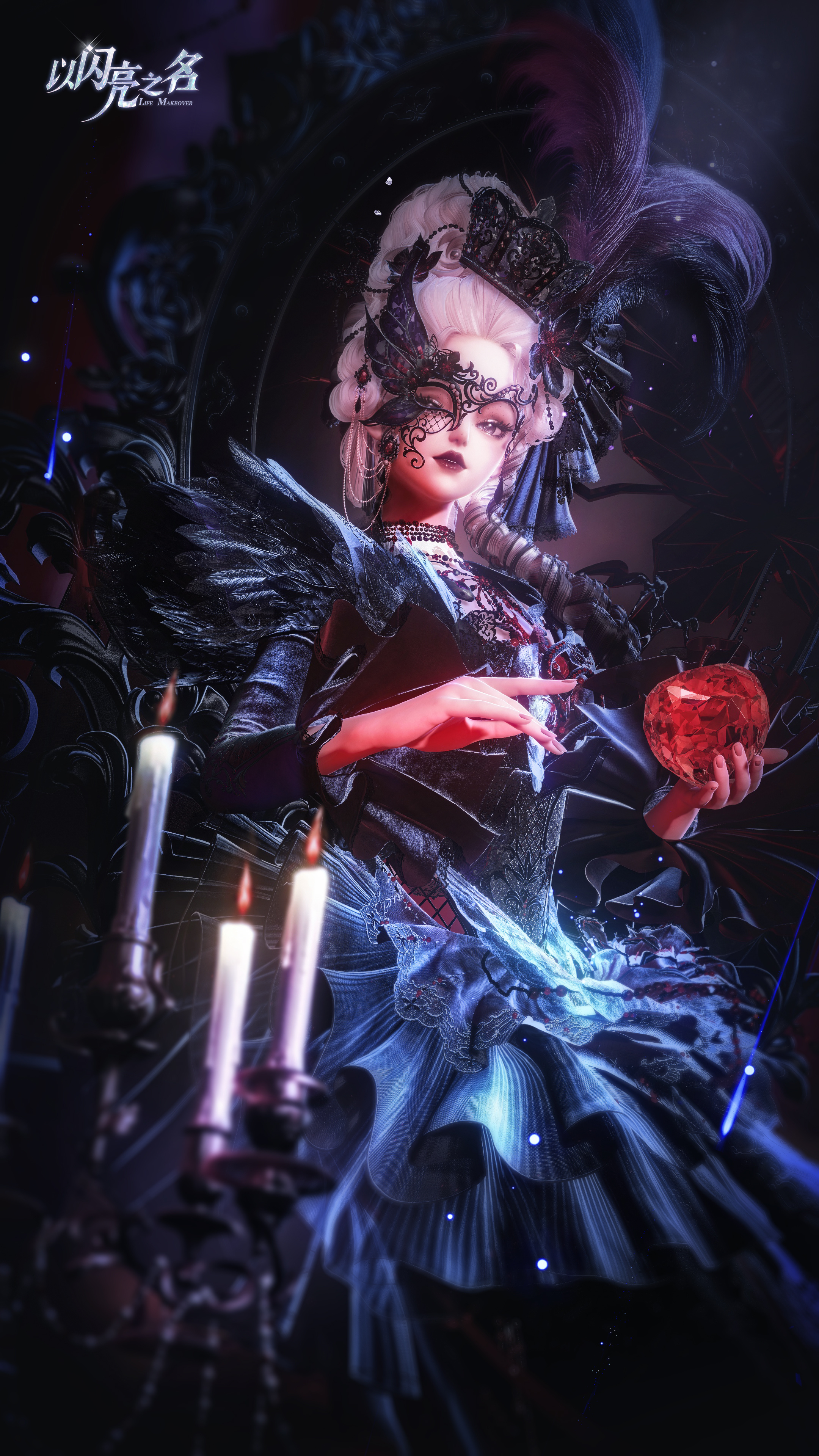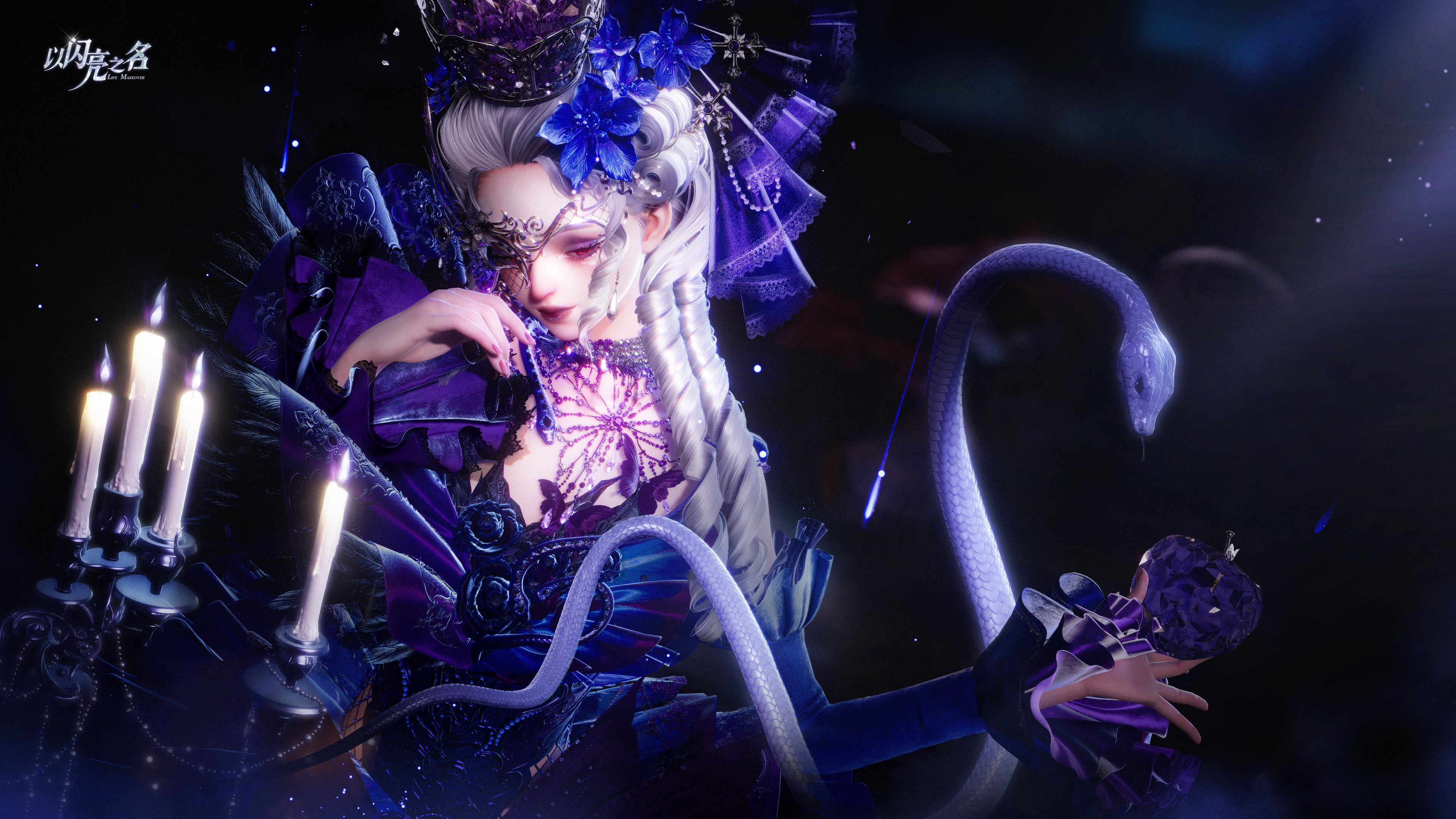 裙装上方持续呈现汁液滴落的特效,节奏克制却始终存在,如同尚未停止的低语。发饰与面饰中,花瓣从花芯处缓慢飘散,细小却持续,让角色仿佛始终被某种无形力量包围。悬浮在背后的蜡烛并非静止装饰,烛火会随着动作轻微跳动。