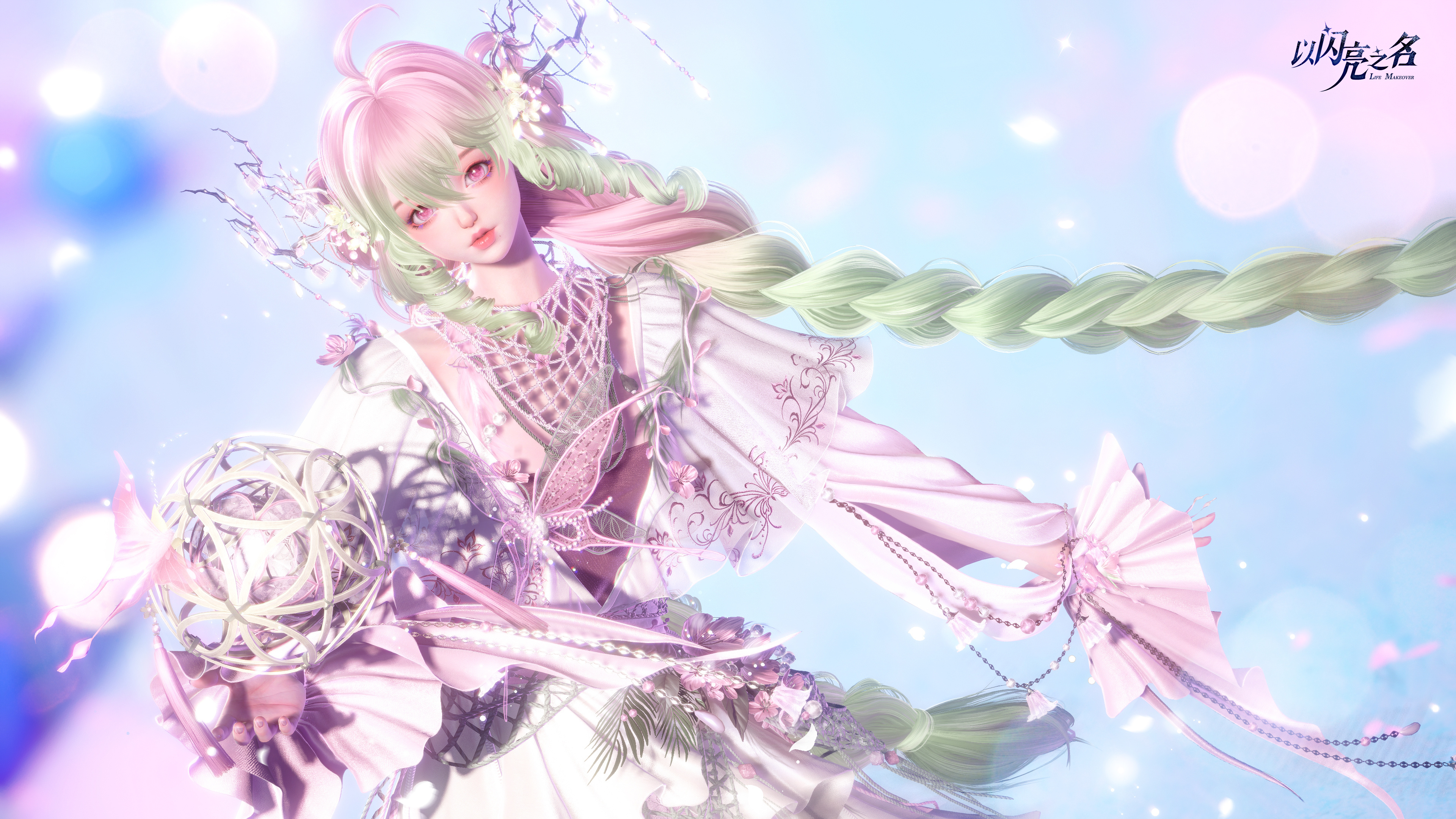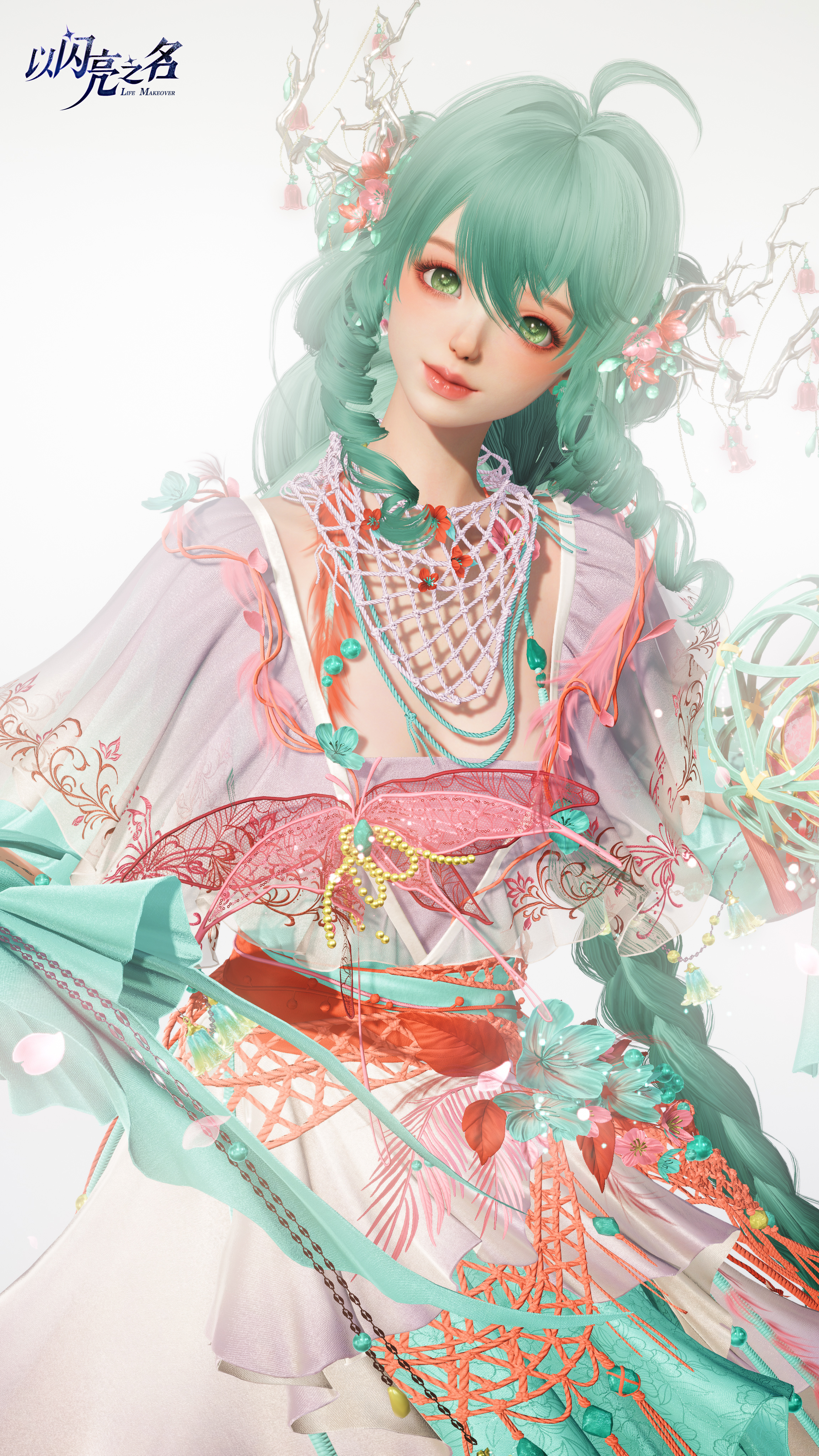 设计的核心灵魂,在于对自然生灵的敬畏与非遗文化的致敬。我们选用了“绿绒蒿”这一生长在高山之巅、孤傲而纯净的生灵作为腰间的视觉重心。绿绒蒿的生命力,赋予了整套时装一种超脱尘世的山野精灵感。与之相呼应的,是国家级非遗元素——滚灯的加入。我们将这种承载了千年人文智慧的民间手艺,转化为可在指尖灵动的点缀,完美的阐述一场关于“守候”的表达。滚灯在民间文化中象征着团圆与永恒,而我们在游戏中,让这份古老的热忱以一种更具幻想色彩的方式在掌心生生不息。