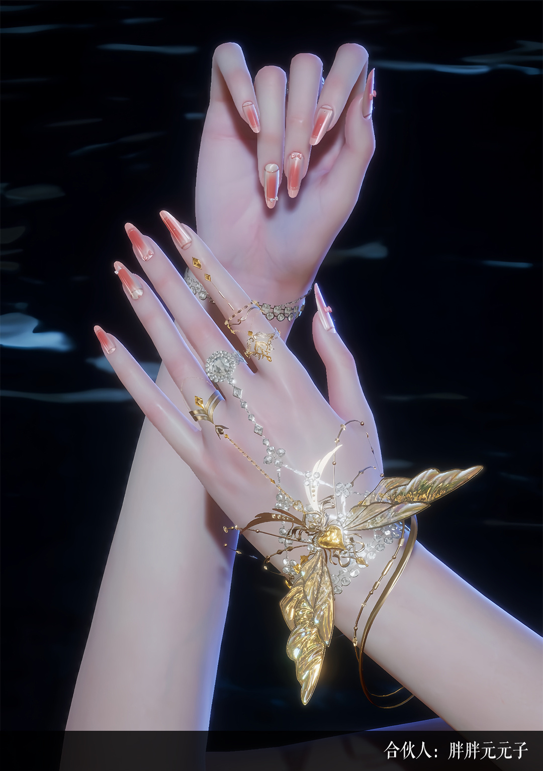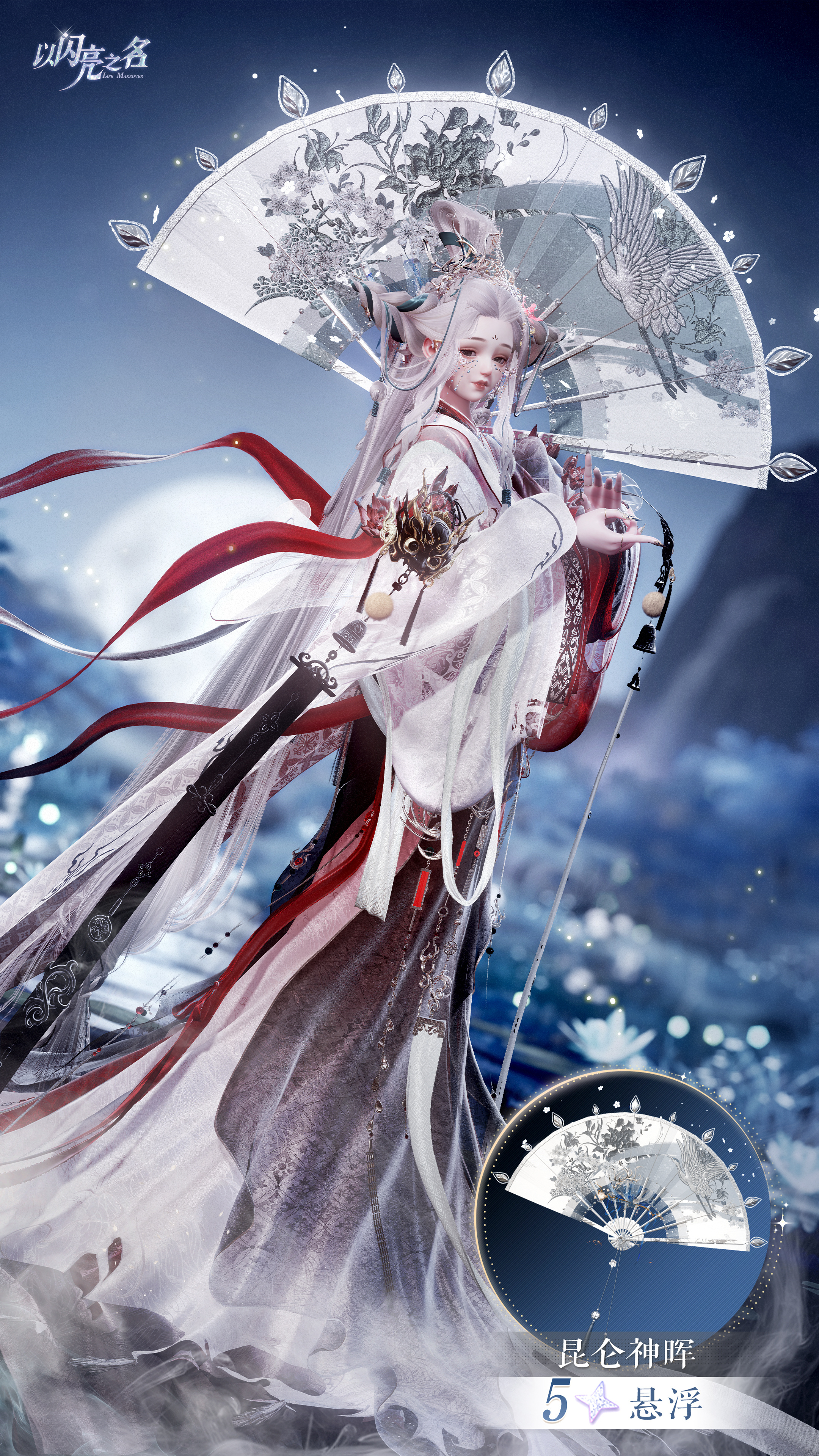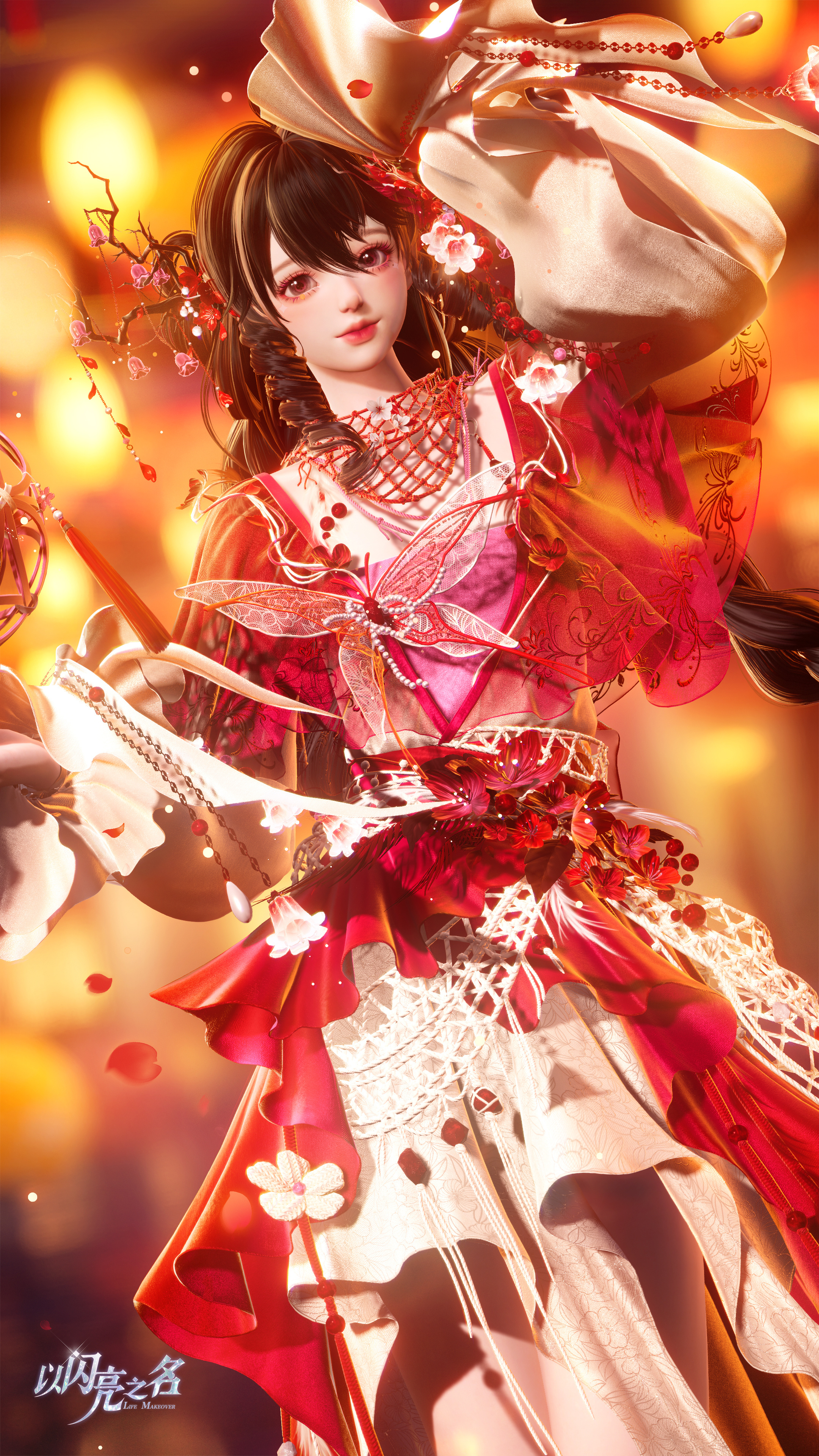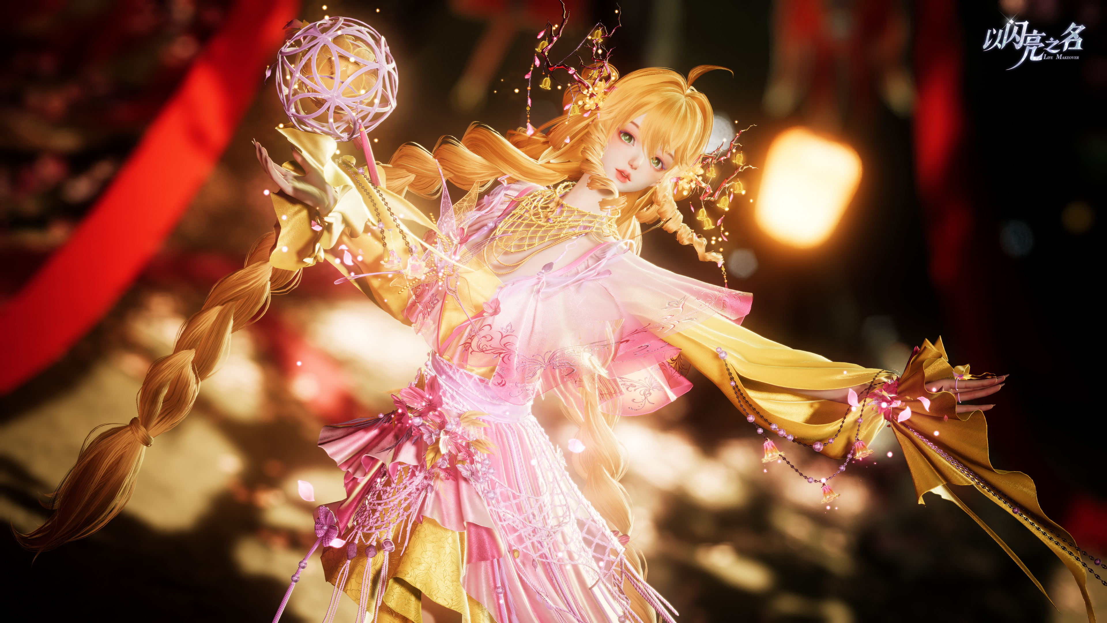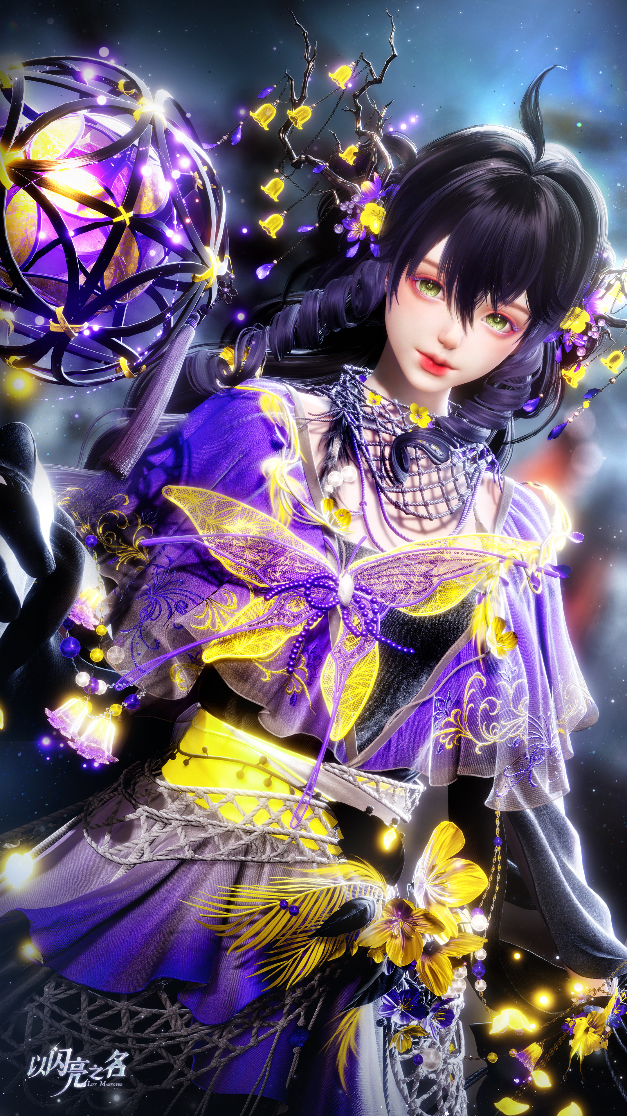 作为本套时装最具辨识度的部件,手持滚灯的设计凝聚了极高的技术含量。滚灯作为一种非遗技艺,其精髓在于无论外圈如何旋转,内里的光源始终屹立不倒。我们在游戏中完美复现了这一“旋转不灭”的特性。球体内部的自发光闪烁光球是整件饰品的动力源泉,它在核心处散发着光点粒子,吸引着身体发光的蛾子环绕飞舞。从建模的精细度到粒子的扩散路径,我们进行了无数次模拟。我们希望合伙人在操作角色旋转时,能真实感受到这种物理上的奇妙平衡。蛾子的身体在火光映照下泛起的微光,与球内散落的光点交织在一起,构成了一幅极具东方神秘色彩的灵动画面。