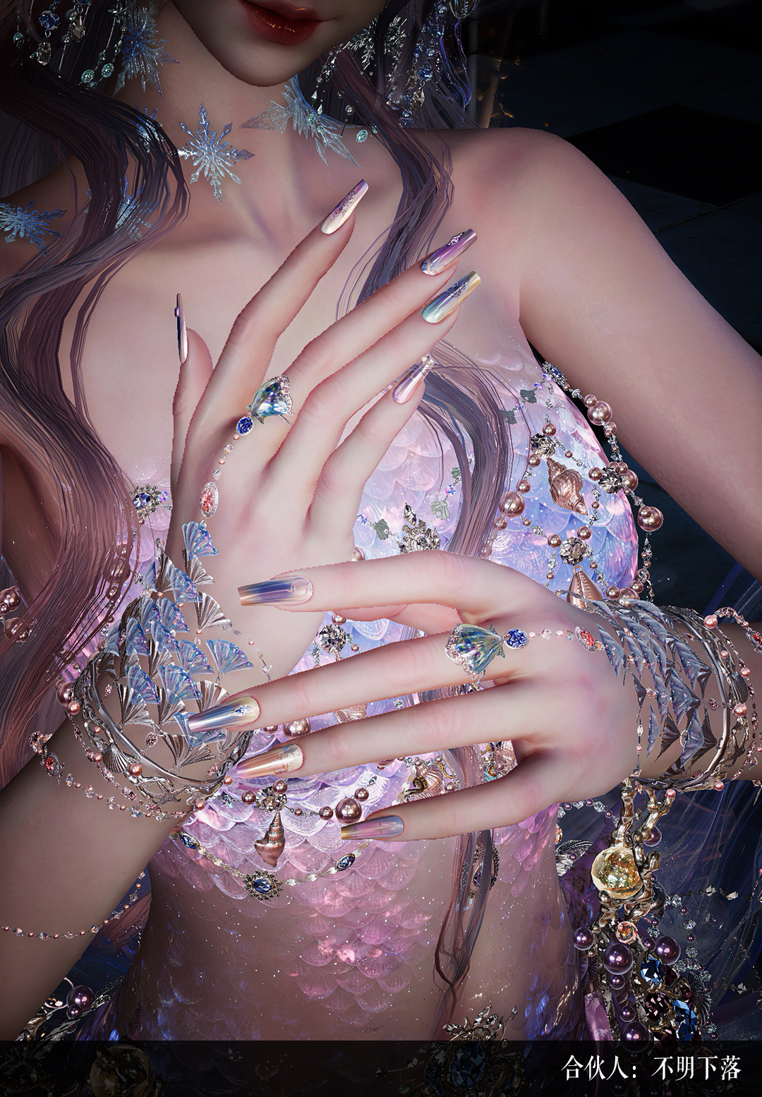 为了将这些充满灵气的设想转化为游戏中真实可感的质感,我们的技术与设计团队共同完成了一场极具挑战的“粒子革命”。最令我们自豪的,是这套时装所呈现的“呼吸感”。铃兰花头饰并非静止的模型,我们为其赋予了明明灭灭的自发光特效。这种光影的跳动频率,模拟了生物真实的呼吸节奏,配合从花苞处缓缓下坠的、星星闪闪的粒子,让每一位合伙人在行走间,都仿佛带起了一阵星尘细雨。在连衣裙的处理上,我们克服了“静态服装动态化”的难题。蝴蝶装饰中心的紫色宝石,不仅拥有通透的折射感,更被赋予了自发光效果,不断向外溢散出微小粒子,仿佛是蝴蝶在振翅间抖落的灵粉。