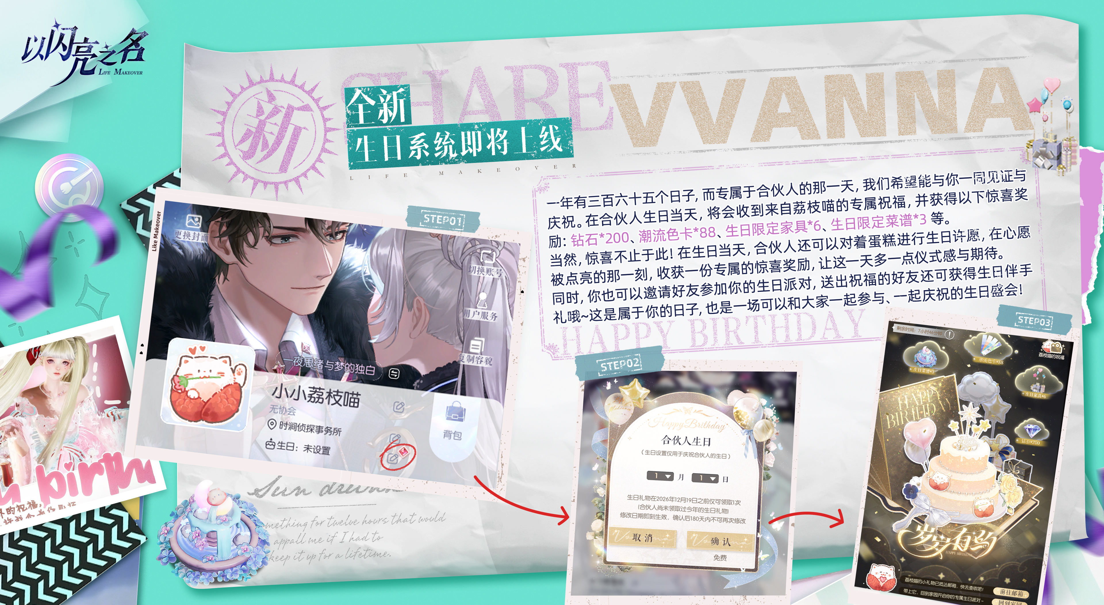 在合伙人生日当天,将会收到来自荔枝喵的专属祝福,并获得以下惊喜奖励:钻石*200、潮流色卡*88、生日限定家具*6、生日限定菜谱*3 等。