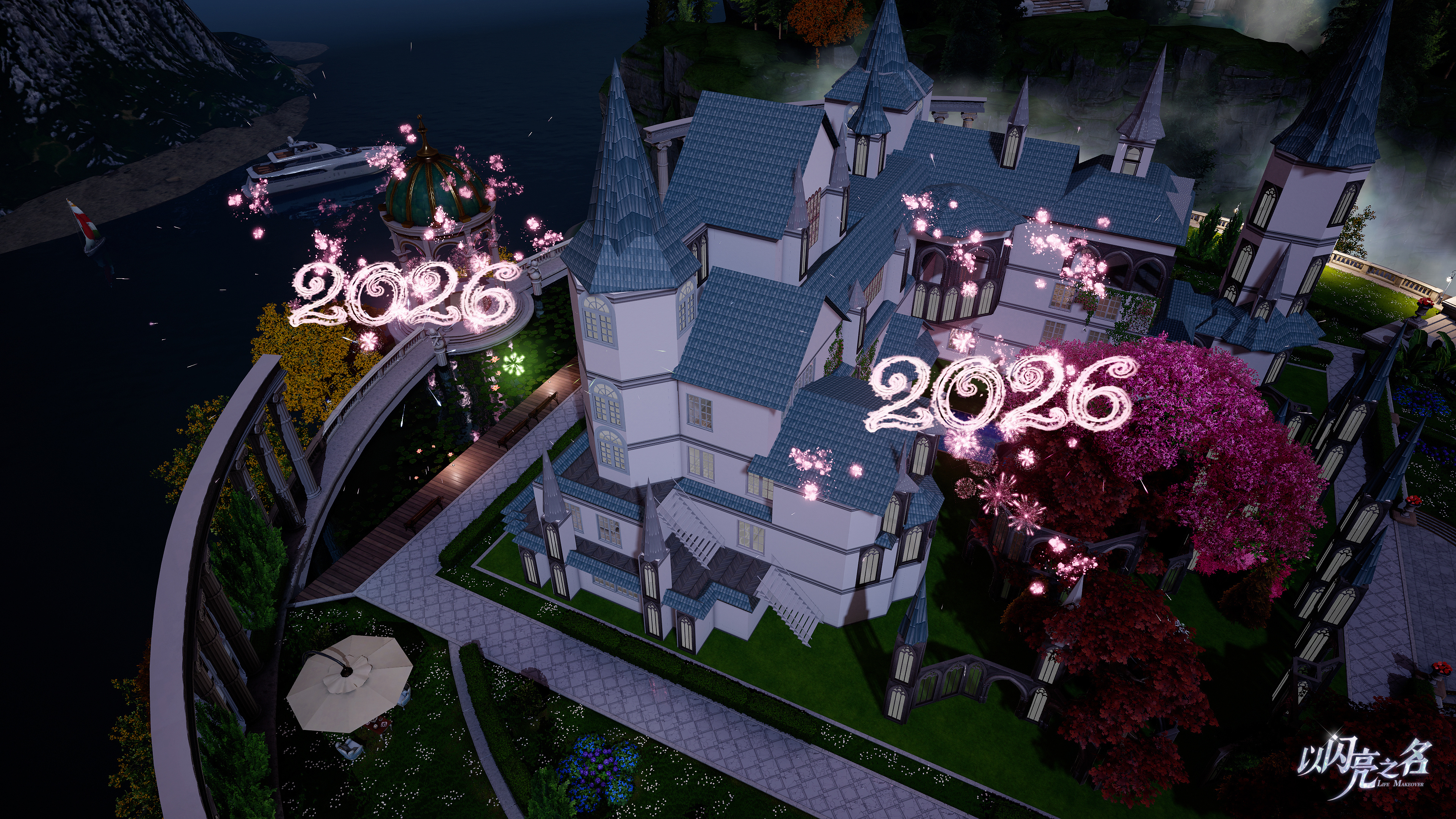 1月1日00:00-1月3日23:59,闪亮世界16:00~02:00,对应现实时间00:00~02:30、06:00~08:30、12:00~14:30、18:00~20:30,进入家园或沙滩广场即可共赏绚烂烟花~