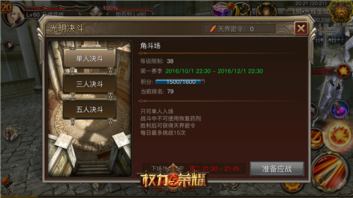 光明决斗玩法采用积分制,优先匹配积分相同的玩家进入战斗,因此积分越高,越有可能匹配更高水准的玩家进行PK,因此,处在高段位的勇士们在进行切磋的时候,一定要做好准备了!拉上你们的亲朋好友为你助威呐喊,叫上强力队友与你一同战斗到底。谁能成为最终的王者,让我们拭目以待!
