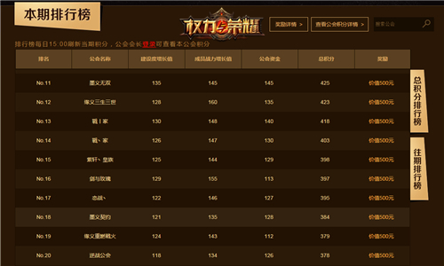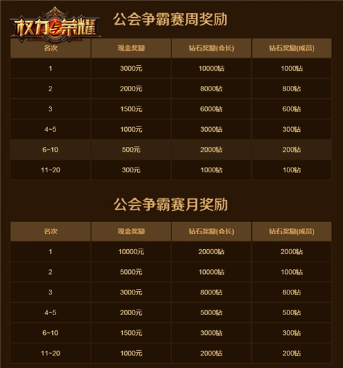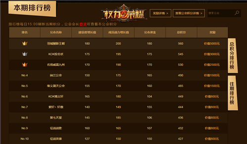 本次排行榜排名是按照公会建设度增长值、所有成员总战力增长值、公会资金增长值三项进行积分排名的,所以没有获得奖励的公会的勇士们不要气馁。除了周赛之外,公会争霸还设有月赛,根据多周排行积分的平均值进行综合排名,榜上有名的公会将有机会赢得万元现金大奖。各大游戏公会的兄弟们还等什么,快来加入公会争霸赛,争夺至尊荣耀吧!