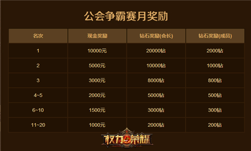 经过长达一个月的角逐,公会争霸赛终于迎来了月度总冠军,最终的王者是——羽城極影王朝!本次月冠军公会将获得10000元的现金大奖,同时会长将会获得20000钻石奖励,公会成员也都将获得2000钻石。分获亚军和季军的是“荣耀萌萌哒”公会和“血傲丶狂狮殿”公会,他们将分别获得5000元和3000元的现金奖,会长和成员同样会获得丰厚的钻石奖励。另外,征战战歌、缘义晟天公会等老牌明星公会也凭借超强的实力荣登排行榜前列,另外,排行前20名的公会都将获得丰厚的现金和钻石奖励。