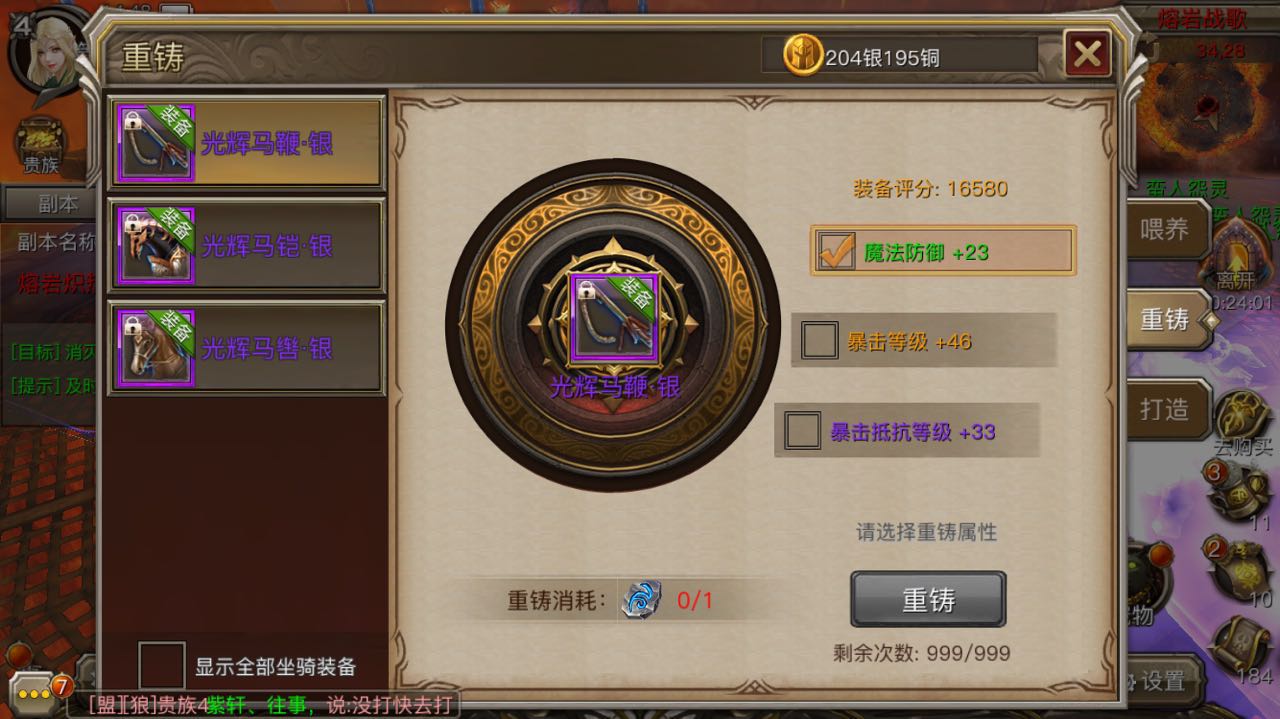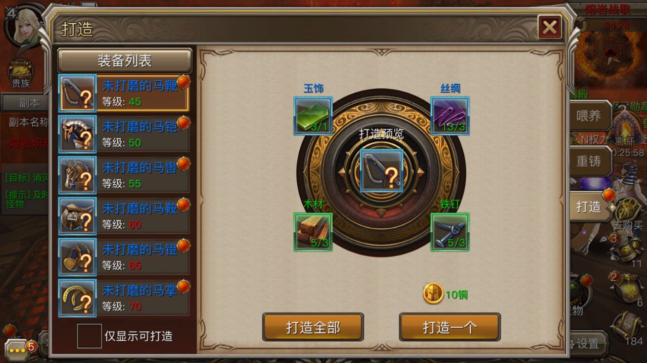 成功通关熔岩战歌副本,根据副本难度玩家可以获取大量的马匹装备材料。玩家可以在坐骑界面对材料进行打造,获得不同品质的坐骑装备。使用高品质坐骑装备,通过重铸石改变坐骑装备附加属性的品质,可以获得大量的战力哦!