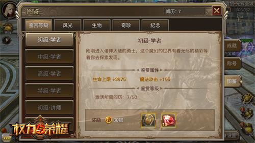 图鉴共分为风光、生物、奇珍、纪念四大类,每一类又包含多个小分类,玩家可以通过执行特定区域的任务、击杀怪物或是开启宝箱等多种方式获得图鉴,收集到的每个图鉴都会附带属性加成,并且提升阅历值。只需稍加耐心,多达数百种图鉴集腋成裘,就能为你带来巨大的战力提升。