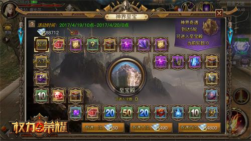 还记得小时候摇骰子走格的喜悦吗?《权力与荣耀》新资料片将于4月24日至30日开启大富翁式玩法——神界至宝,经典的随机走格玩法让你步步惊喜!只不过骰子换成了“奇遇”,每次奇遇都会随机走出1-6步,包含礼盒、积分、珍稀道具以及拉风的坐骑“银月魔狼”等海量福利降临每个格子,无论走到哪里都是满满的收获。走完一轮还能进入至宝殿抽奖,得到更加珍贵的大礼。当乐趣与惊喜相遇,你走出的每一步都是好棋,快来神界至宝开始你的收获之旅吧。